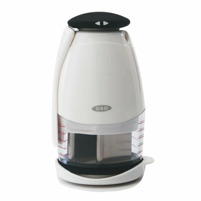 Mini chopper is perfect for fine dicing. Just press the soft knob of this chopper and the blades will rotate for even chopping. Shock is absorbed by an internal soft bumper which increases comfort and sound quality.