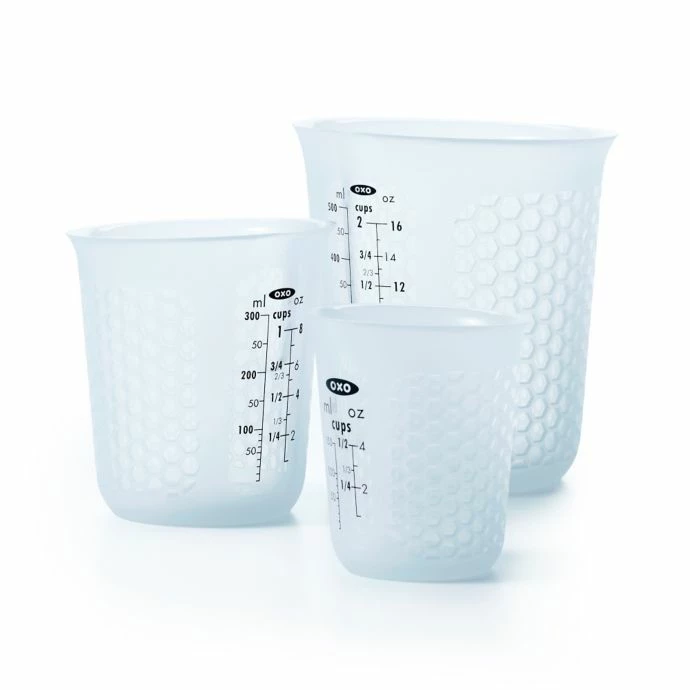 - The OXO Good Grips Squeeze & Pour Silicone Measuring Cup Set makes it easy to mix, measure, microwave and pour all from the same measuring cup