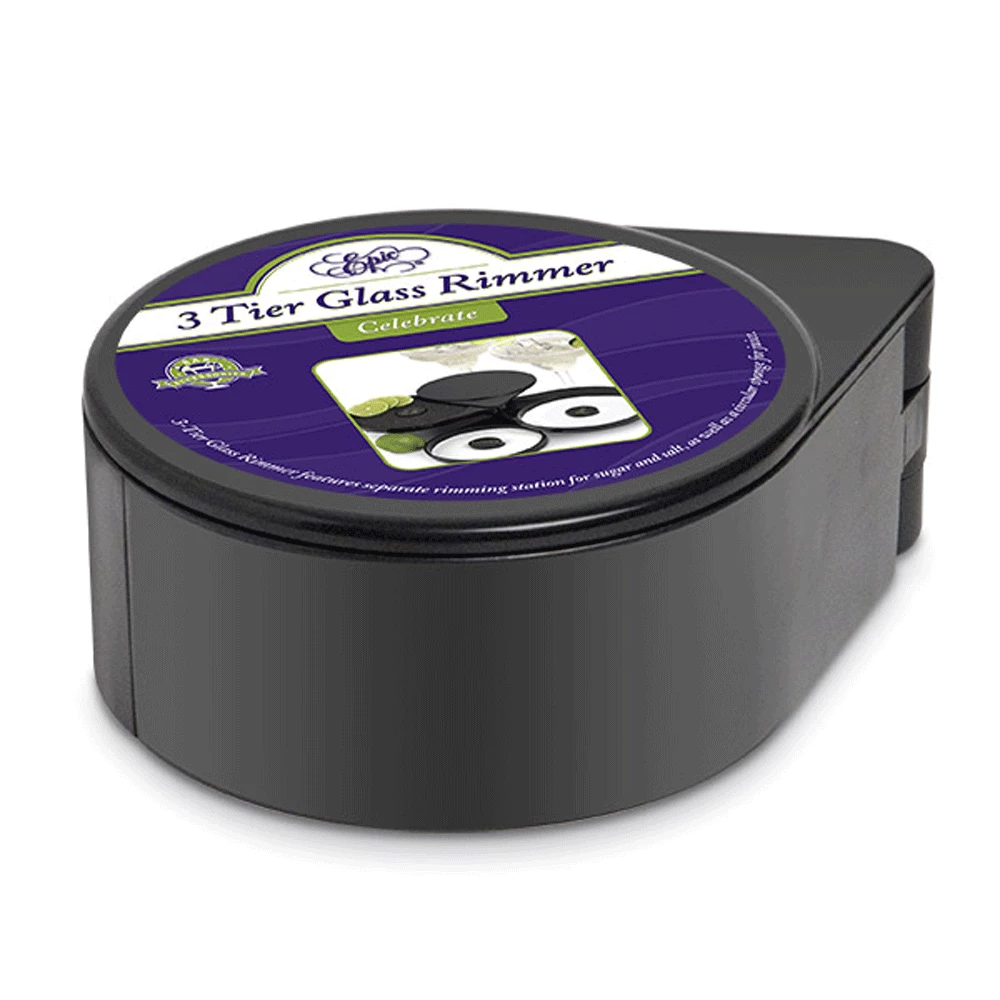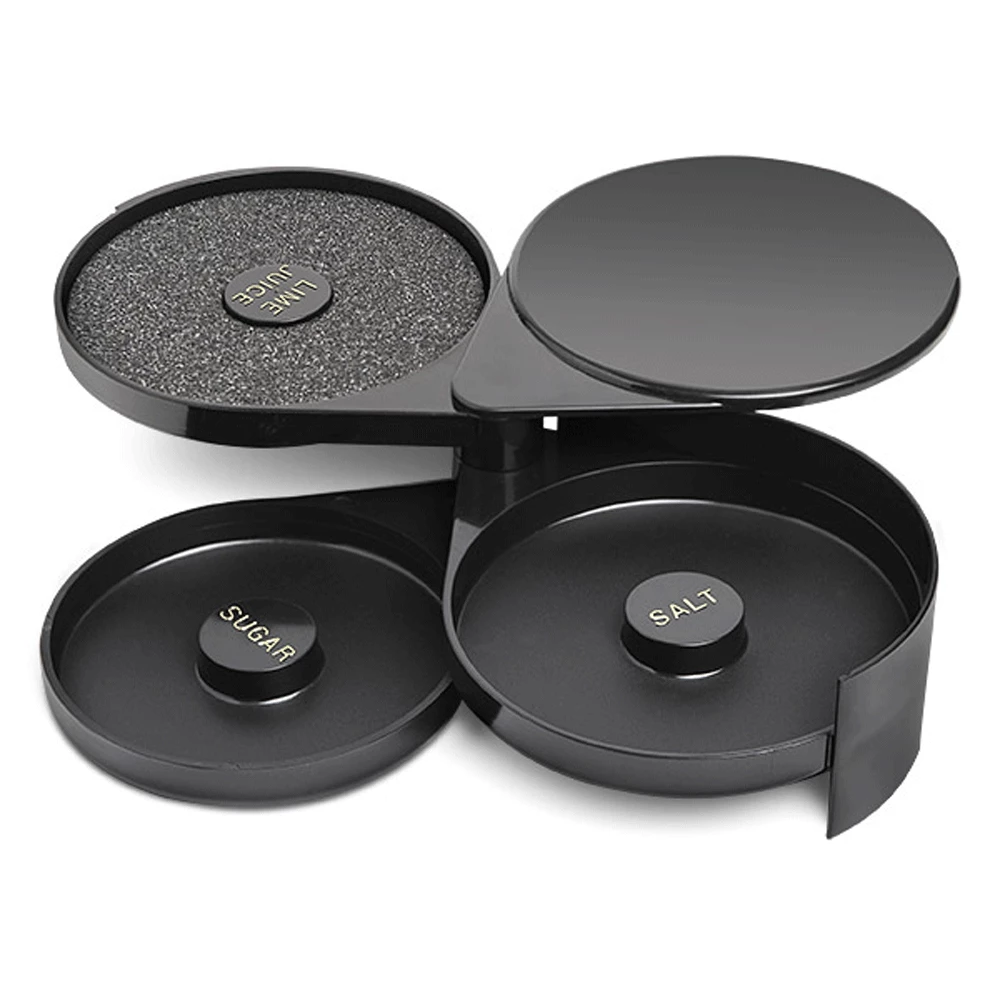 Just like professional bartenders use, this 3-tier glass rimmer features a labeled rimming station for sugar and salt, as well as a circular sponge for juice. Made of durable food safe ABS plastic, this handy tool folds up nicely when not in use.