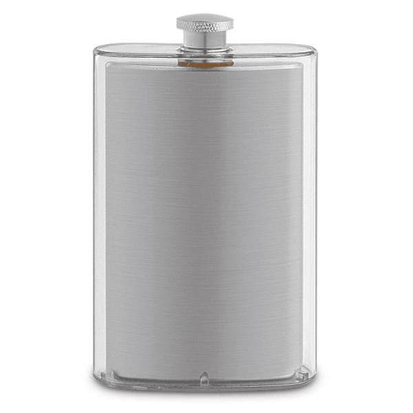 This handsome translucent flask has an exterior made of polystyrene with a stainless steel inner body. The double-wall technology helps keep the contents cold longer. Capacity: 5oz.