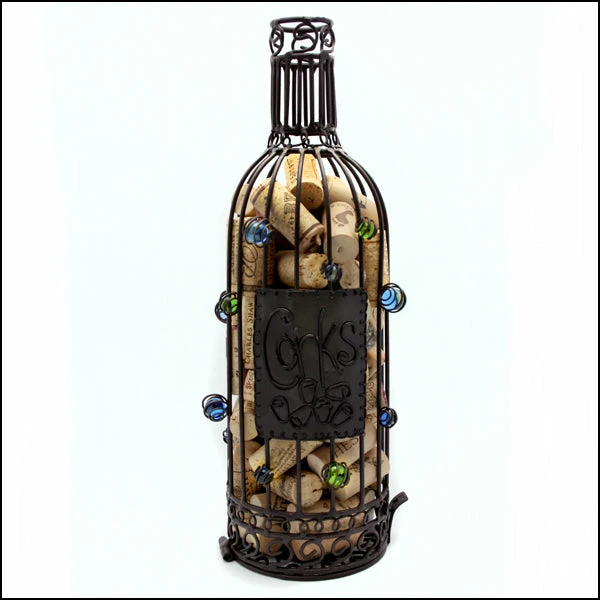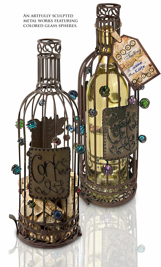 A fun and innovative way to keep and cherish all of your wonderful wine memories. Just drop your treasured corks in the top. Artfully sculpted metal work with colored glass spheres. Reverse side depicts a grape image in metal. Bottom hinges open to release corks.