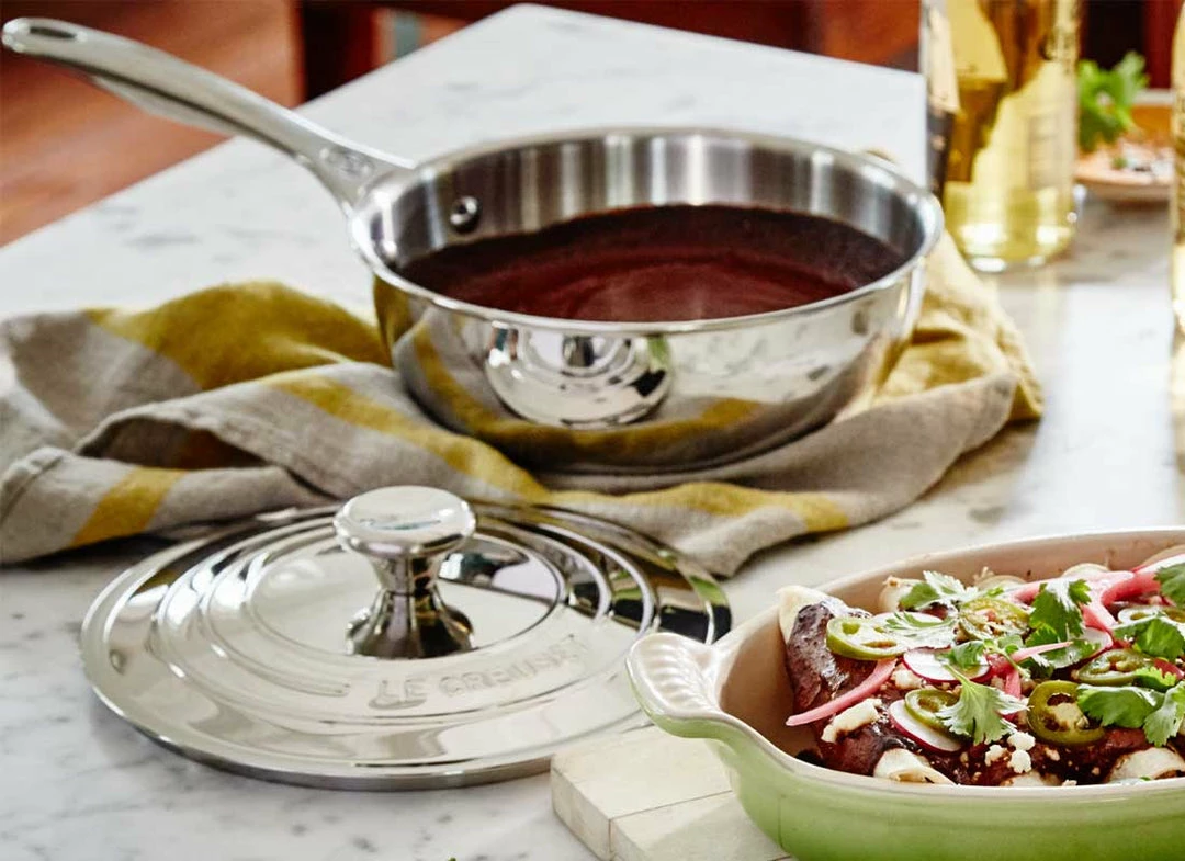 A saucier pan, sometimes called a chef’s pan, is designed with a rounded bottom to keep ingredients moving, and flared sides to facilitate easy whisking and stirring. It is particularly suited to dishes that involve constant stirring, such as sauces, risottos and custards. Ergonomic handles make for convenient carrying and lifting.