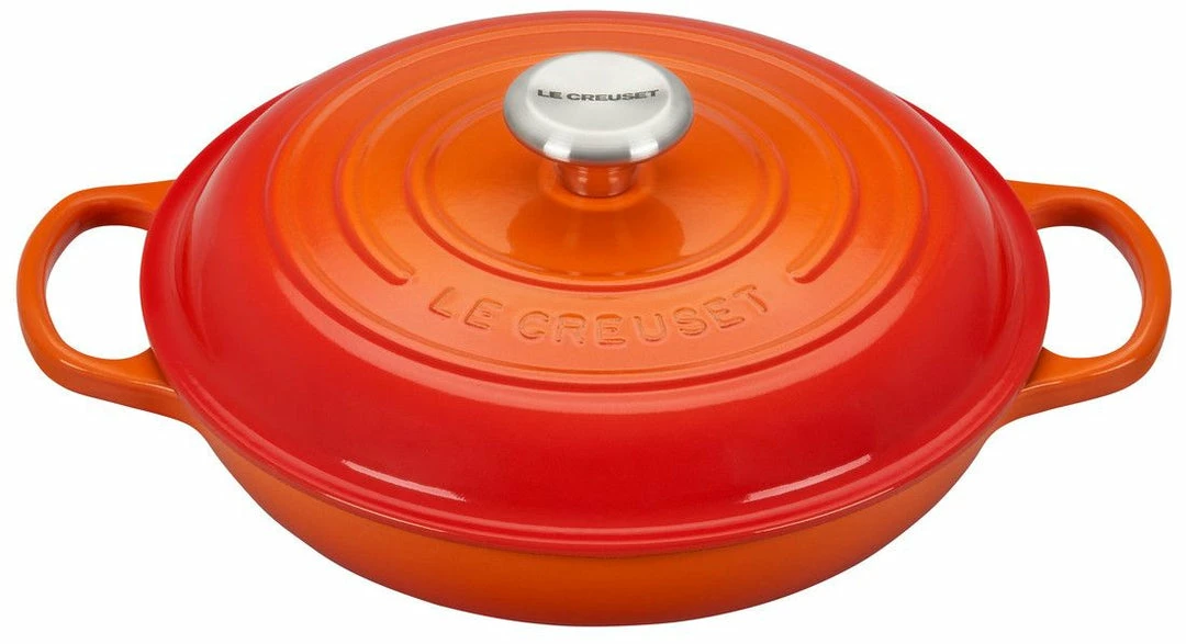 The enameled cast iron braiser is uniquely designed for maximum performance, transforming tough cuts of meat and hearty vegetables into tender, flavorful dishes. Food is first seared over high heat, then finished slowly in a flavorful liquid. The wide base of the braiser allows ingredients to be placed in a single layer for proper searing; once liquid is added, the domed lid continuously circulates steam to lock in moisture and flavor.