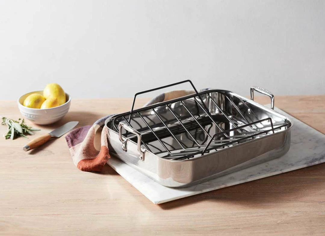 Roast meats and vegetables to perfection in this stainless steel roasting pan. A precision-pour rim creates clean pouring and a nonstick rack elevates food for even cooking.