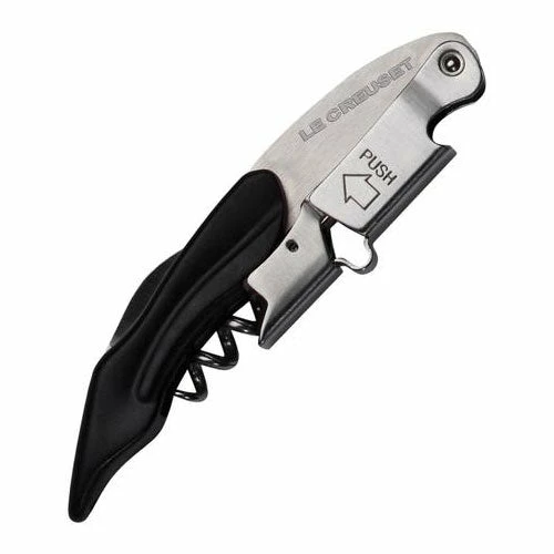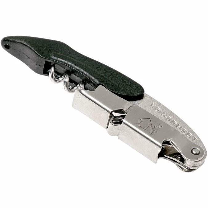 Le Creuset Professional quality Waiter’s Corkscrew – Patented 2-step system improves leverage and makes removal of the cork smoother and easier. The Le Creuset Waiter’s Corkscrew is made of professional quality, stainless steel corkscrew features a non-stick coasted screw, serrated foilcutter and bottle opener. Because the Le Creuset Waiter’s Corkscrew is designed for waiters, it conveniently slips into a pocket, apron or drawer. The Le Creuset Waiter’s Corkscrew evens travel wells too.