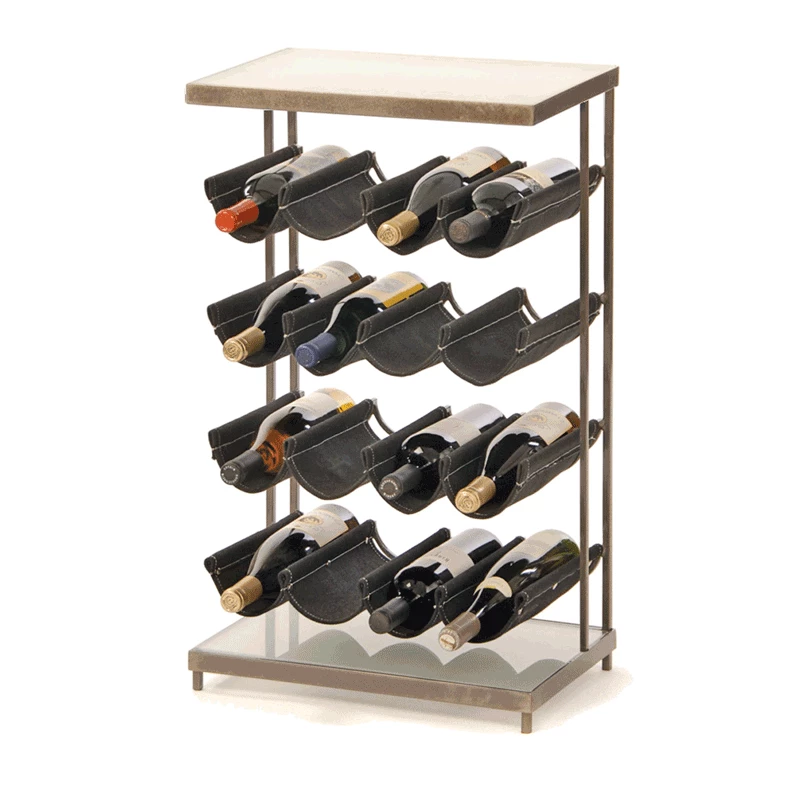 The Oenophilia Cantilever Wine Rack features canvas slings that give your bottles a floating effect. Attached to a gunmetal-finish stand with glass top and base, the Oenophilia Cantilever Wine Rack is the epitome of contemporary style. The Oenophilia Cantilever Wine Rack holds 16 bottles.