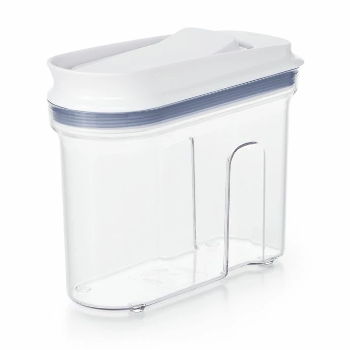 This Food Container with Dispenser Top from OXO Good Grips has a clear plastic bottom that makes contents easy to see. It has a contoured shape for easy gripping and pouring, and features an airtight dispenser top that opens with a simple press.