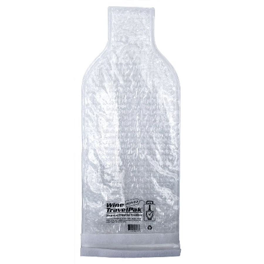 Wine TravelPak Reusable Bottle Protector, Clear Protects wine while traveling in luggage. Insert bottle, top first, into bottom of bag. Seal ziplock closure. Fold over Velcroยฎ flap to secure the bottle. These reusable bags can hold wine, champagne, liquor, olive oil, and other bottles also.
