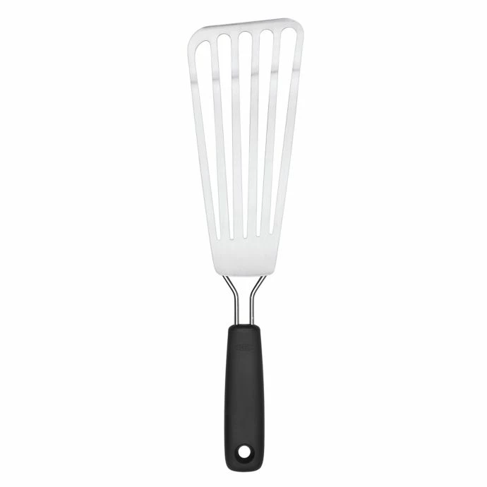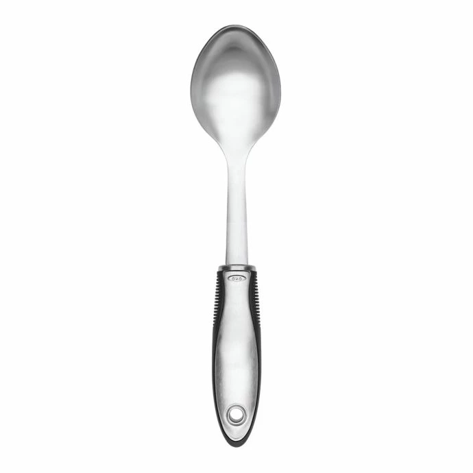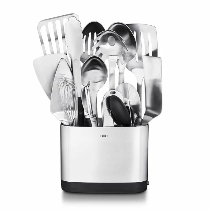Meal prepping and serving is a breeze with OXO Stainless Steel Kitchen Utensils. Molden, ergonomic handles have non-slip insets to reduce hand fatigue. The holder has a removable drip tray for easy cleaninng.