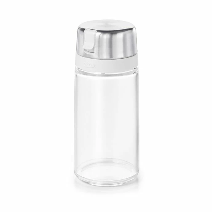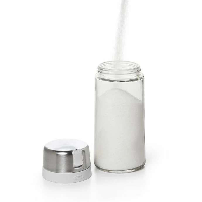 Adding convenience plus the look of a retro-modern diner to your kitchen or table, this Glass Sugar Dispenser from OXO features a clear glass body and sleek stainless steel lid. The easy-open spout allows controlled pouring.