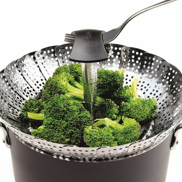 Simply press the handle to pop up steamer, and when done it locks down for storage. The handle is removable for versatile steaming of large items and allows a fork to be inserted for extra reach. Ideal for steaming vegetables, seafood and much more.