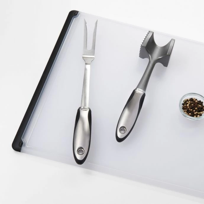 The soft tapered handles of this carving and cutting board provide for easy lifting, while the non-slip edges keep it from slipping. The double-sided use helps prevent cross contamination.