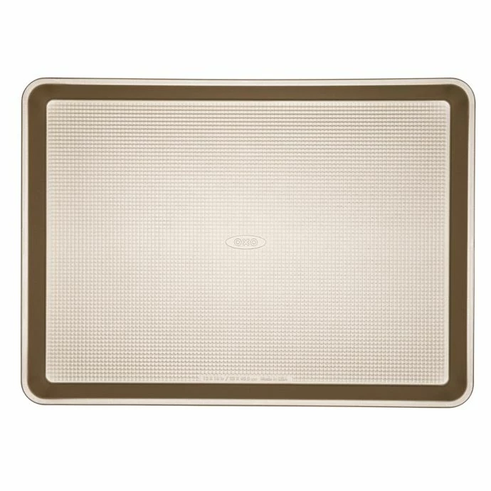Easily bake cookies, croiossants, and more with this OXO Good Grips 3-Piece Nonstick Bakeware Set that includes a pan, rack, and mat. Square rolled edges let you get a firm grasp when inserting and removing pan from the oven to avoid spills.