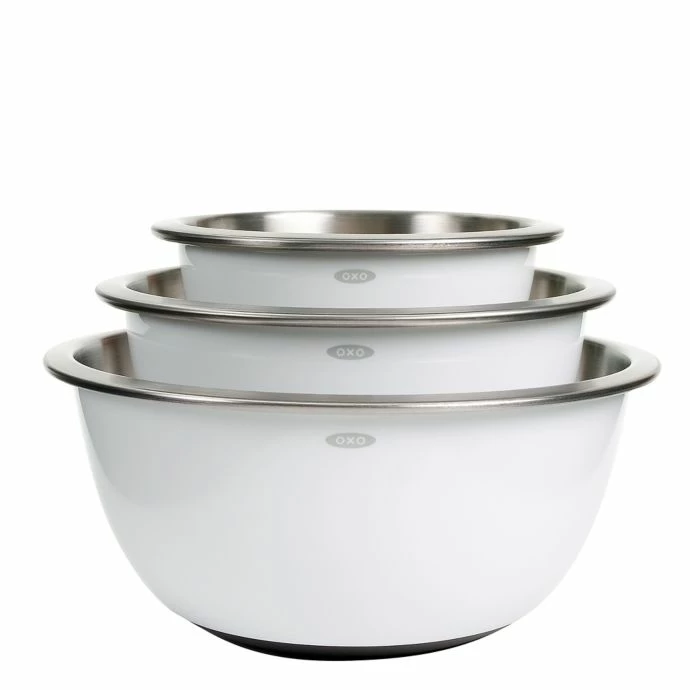 - OXO Good Grips 3-Piece Stainless Steel Mixing Bowl Set feature brushed stainless steel interiors and plastic exteriors to retain temperatures for mixing, marinating and chilling
