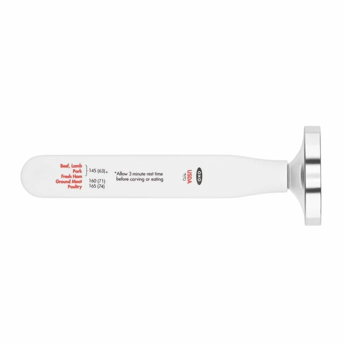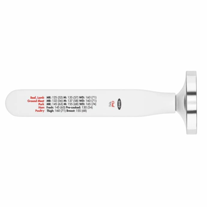 - Convenient storage sleeve has the recommended cooking temperatures and Celsius conversions
