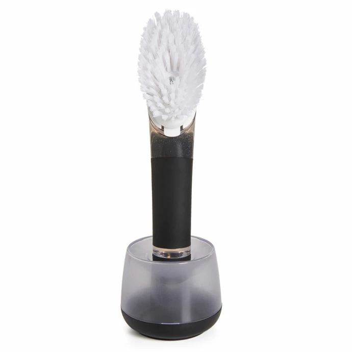 - Includes a soap dispensing dish brush with durable nylon bristles to scrub away food and grease, and a built-in scraper on the back to easily remove baked-on food