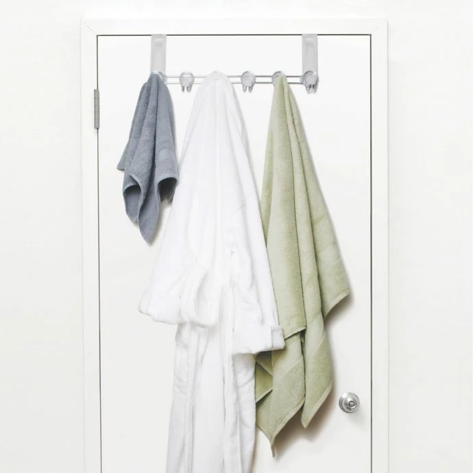 Over-the-door 6 hook rack automatically adjusts to fit securely over thin and thick doors (1 3/8″ to 1 3/4″). It has a soft, non-skid surface that protects door finish, and the non-slip hooks grip items securely.