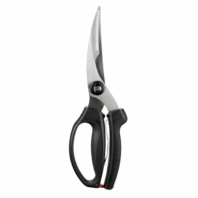OXO Poultry Shears with a micro-serrated blade are a must-have for your kitchen. Its spring loaded soft grip handle prevents hand strain and the handle loop and bolster prevent hand from slipping forward.