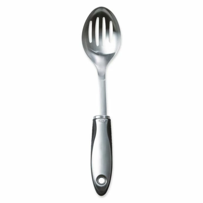 - Sturdy stainless steel head. Sleek, brushed stainless steel handle features flexible non-slip fins for comfort