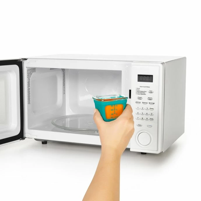 Portion, store, heat, and serve baby food with these OXO Tot Glass Baby Food Storage Blocks with Silicone Sleeves. They are made of borosilicate glass, which is thermal-shock-resistant and include a stackable tray that makes for easy storage.