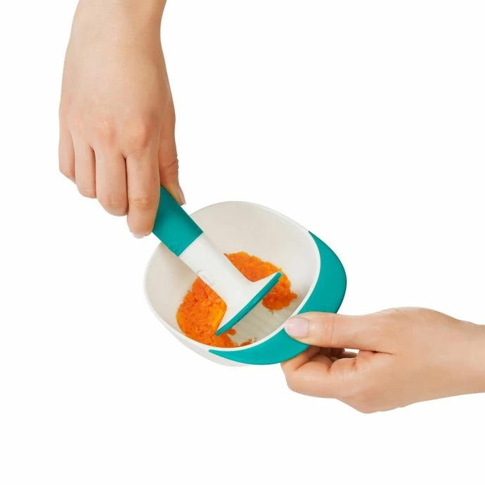 The handy OXO Tot Food Masher makes mashing food for your baby super easy. Steep sides prevent food from slipping out of the bowl while mashing and innovative teeth on the edge of masher help scoop food out when ready.