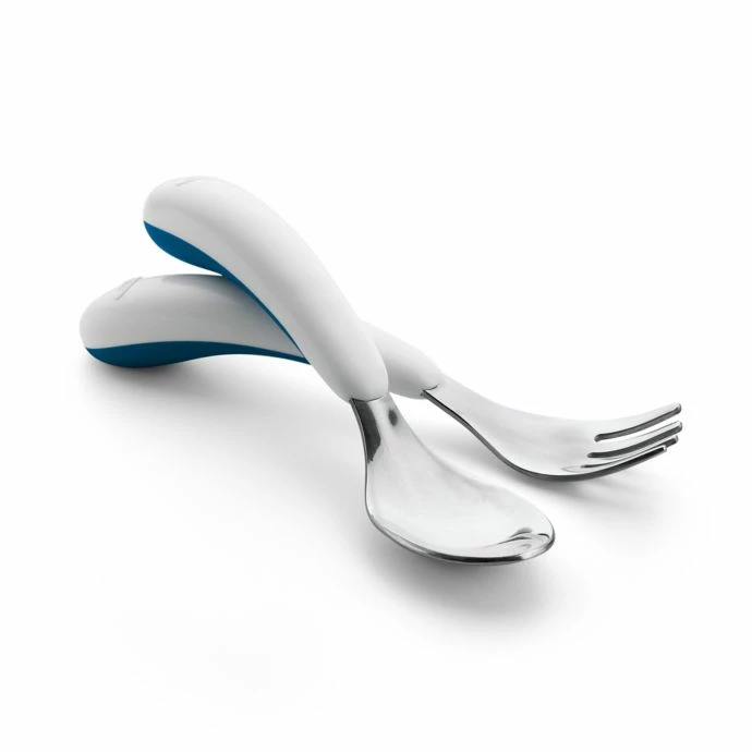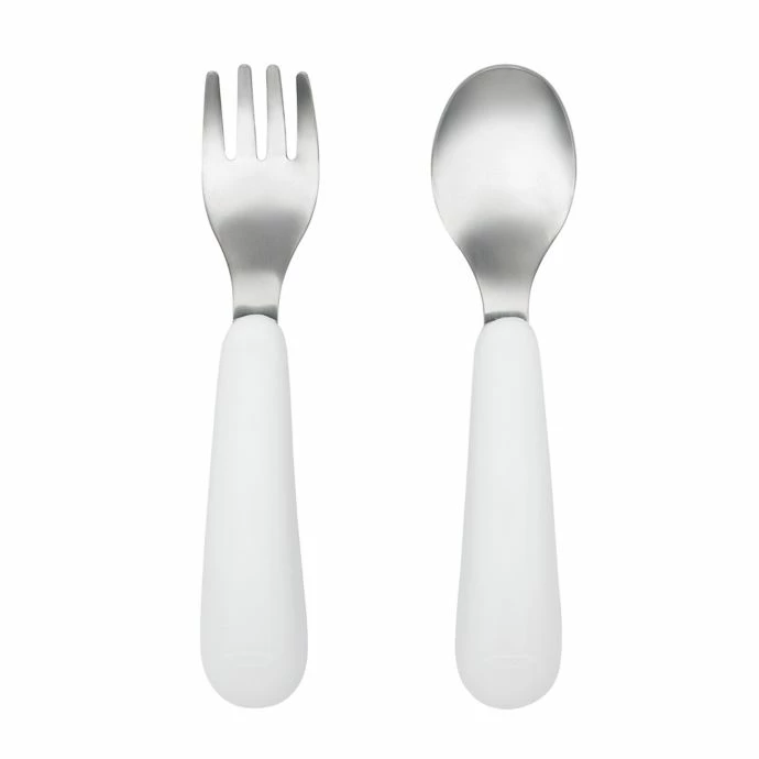 This cute Fork and Spoon set from OXO Tot is ideal for little ones learning to feed themselves. The curved handles are soft and non-slip for easy gripping, fork tines are effective, but have no sharp edges, and the spoon is deep for easy scooping.