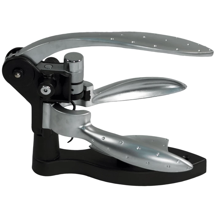 Wine aficionados agree that there really is no substitute for a great corkscrew. The Pampered Grape Wizard Lever Model Corkscrew, with its state-of-the-art engineering and craftsmanship, allows for elegant and effortless removal of even the most difficult cork. The Pampered Grape Wizard Corkscrew has two ergonomically designed gripping handles that fit snugly onto the top of the wine bottle. Drive the corkscrew into the cork by lifting the top lever of the Pampered Grape Wizard Lever Model Corkscrew. With another quick movement of the lever, the cork is ejected from the Pampered Grape Wizard Lever Model Corkscrew. This set includes a Pampered Grape Wizard Lever Model Corkscrew with a satin finish, clear foil cutter, black with white satin corkscrew display stand and a replacement worm.