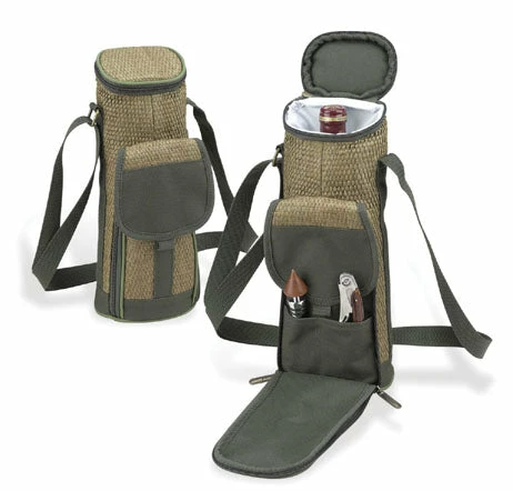 Eco Friendly, insulated wine bottle carrier with PEVA lining. Includes corkscrew and wine stopper