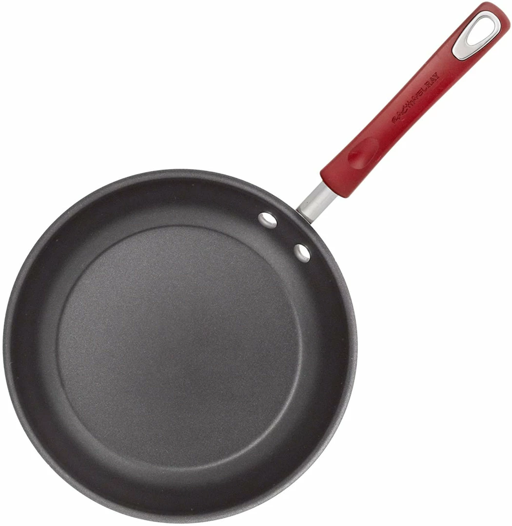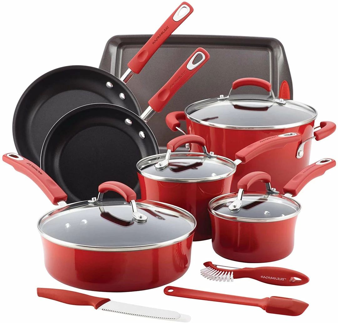 Cook, bake and prep for meals using the Rachael Ray 14-pc. Hard Enamel Nonstick Cookware Set. This set includes pots, pans, skillets, kitchen tools and a baking sheet so you can easily whip up all your favorite dishes. Silicone handles provide a secure grip, glass lids help you monitor the cooking progress and nonstick interiors offer effortless food release and make cleanup a breeze. This cookware set has all the ingredients you need to make delicious meals for your family.