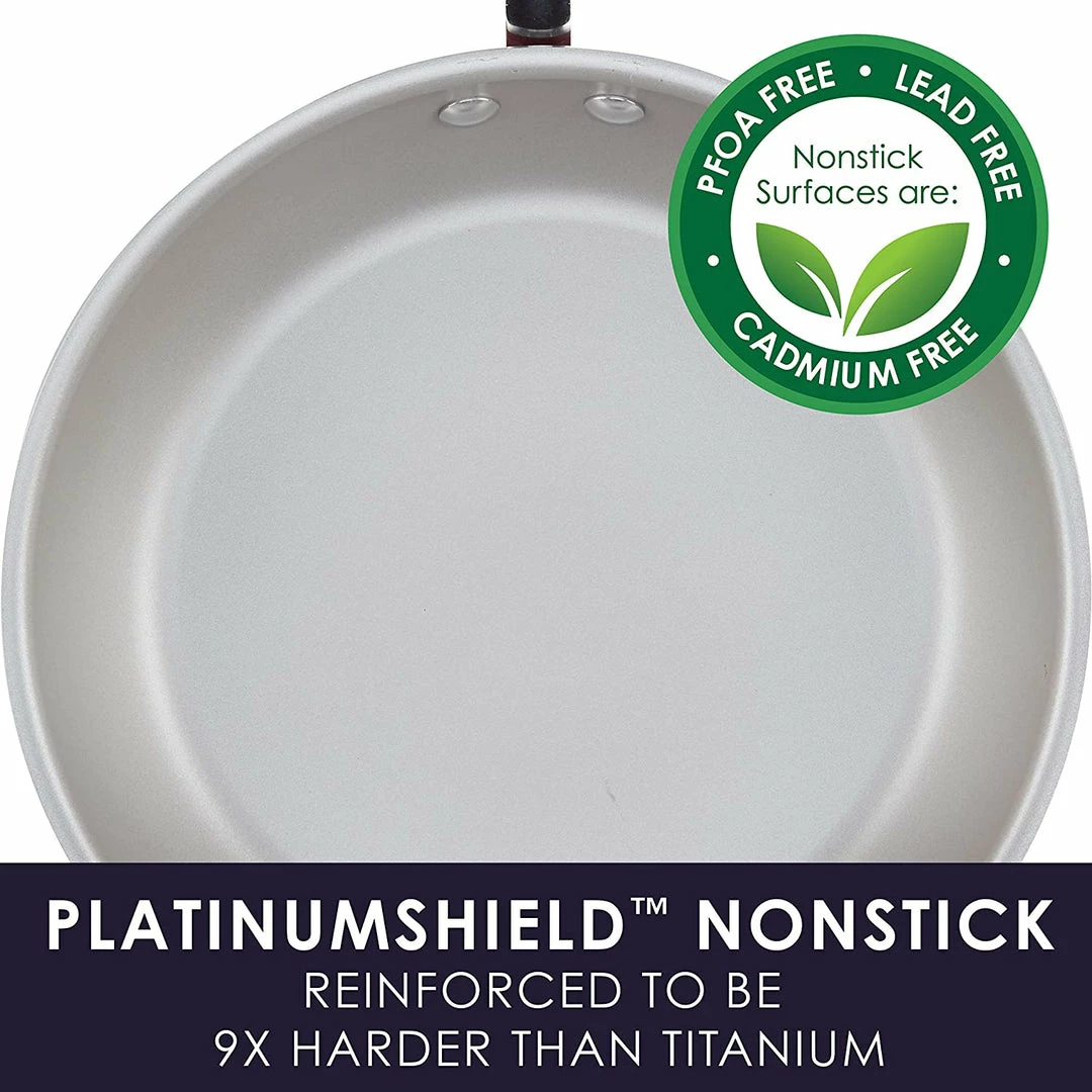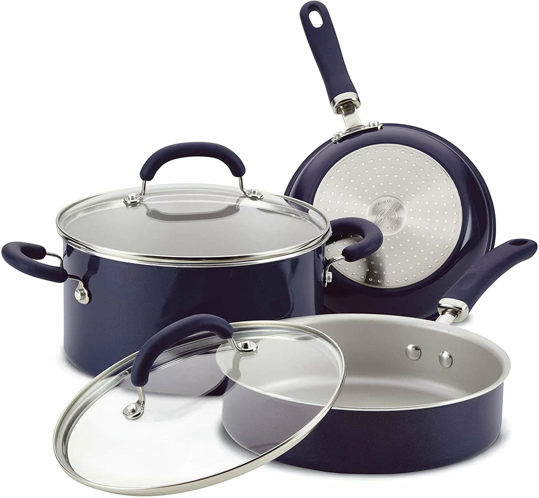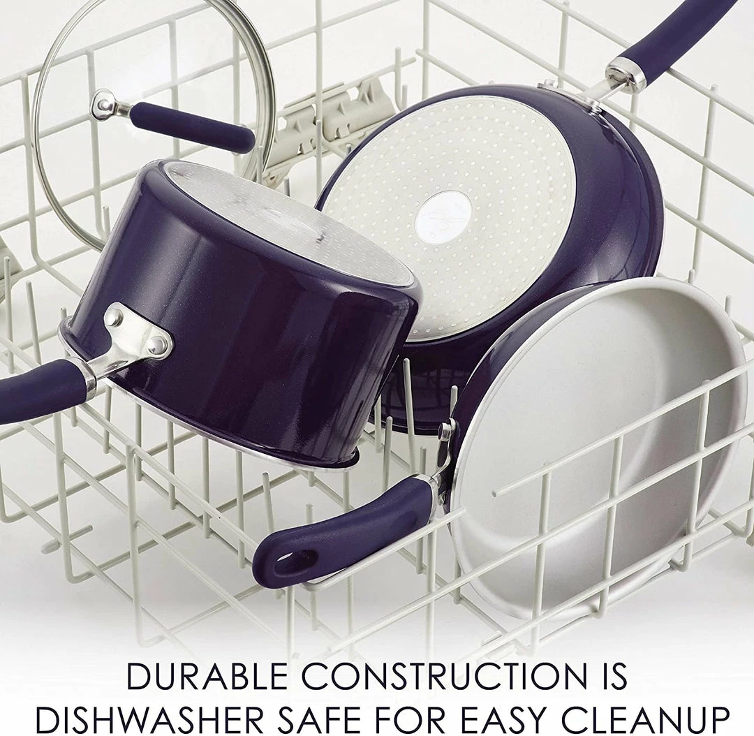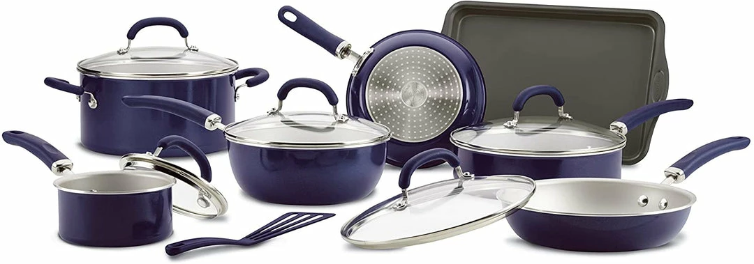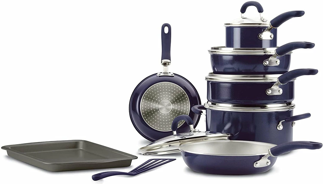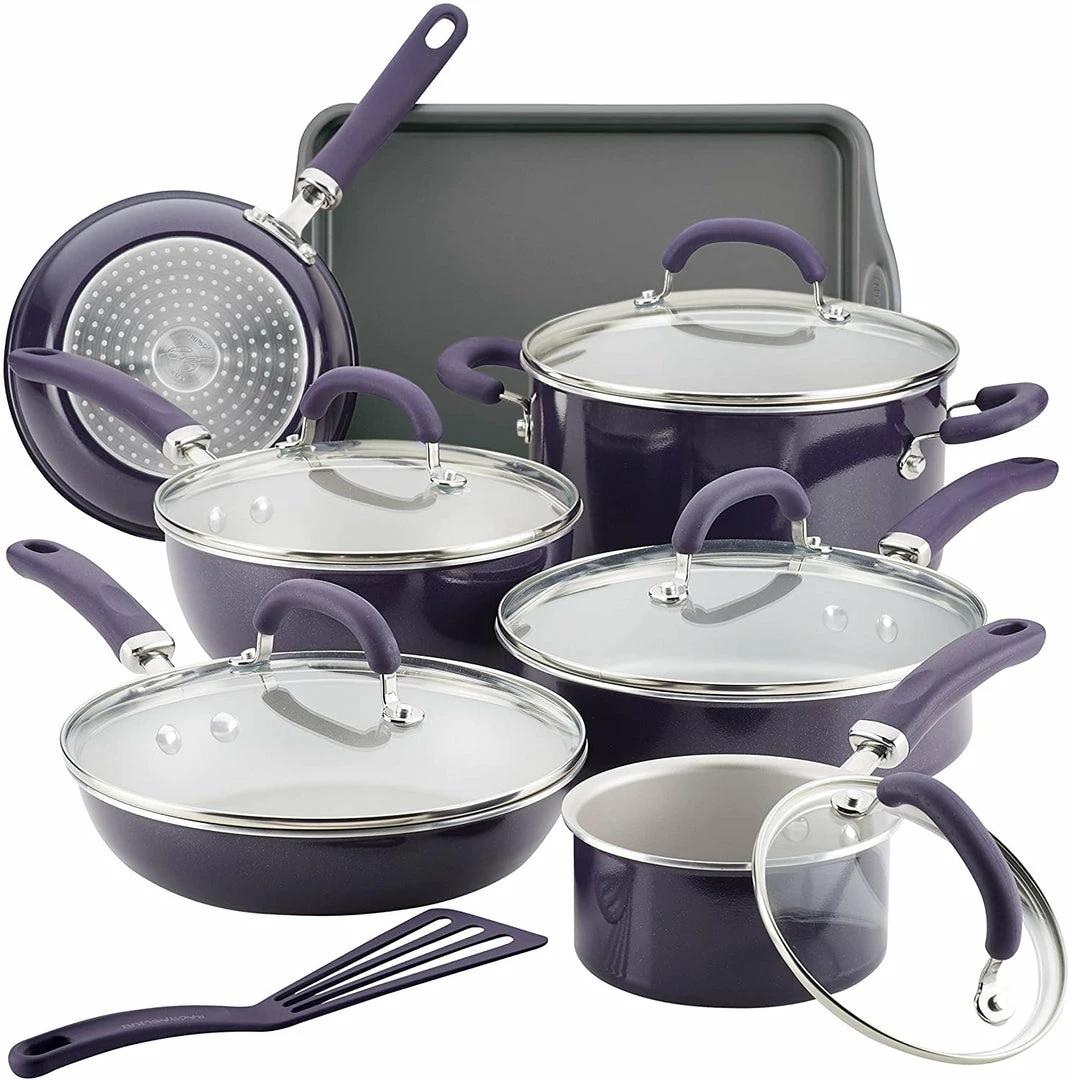 Radiant and solution-oriented, the Rachael Ray Create Delicious 13-Piece Aluminum Nonstick Cookware Set brings high performance and easy convenience to home chefs. Featuring vibrant, shimmering color combined with functionality, this collection of essential pots and pans by Rachael Ray is constructed of durable aluminum for even heat distribution to reduce hot spots. The cookware set features enhanced PlatinumShield Technology nonstick reinforced to be 9 times harder than titanium for effortless food release.Β