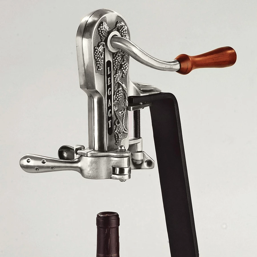 Enhancements to our best-selling, Legacy Stationary Corkscrew, a regal replica of an antique corkscrew, promise years of effort-free openings. A smooth-gliding, Teflon-coated worm removes corks (natural and synthetic) with a simple pull of the handle. Inner workings and grapevine-relief casing made of lasting zinc alloy. Antique pewter finish. Can also mount to your bar. The corkscrew is synthetic cork friendly.