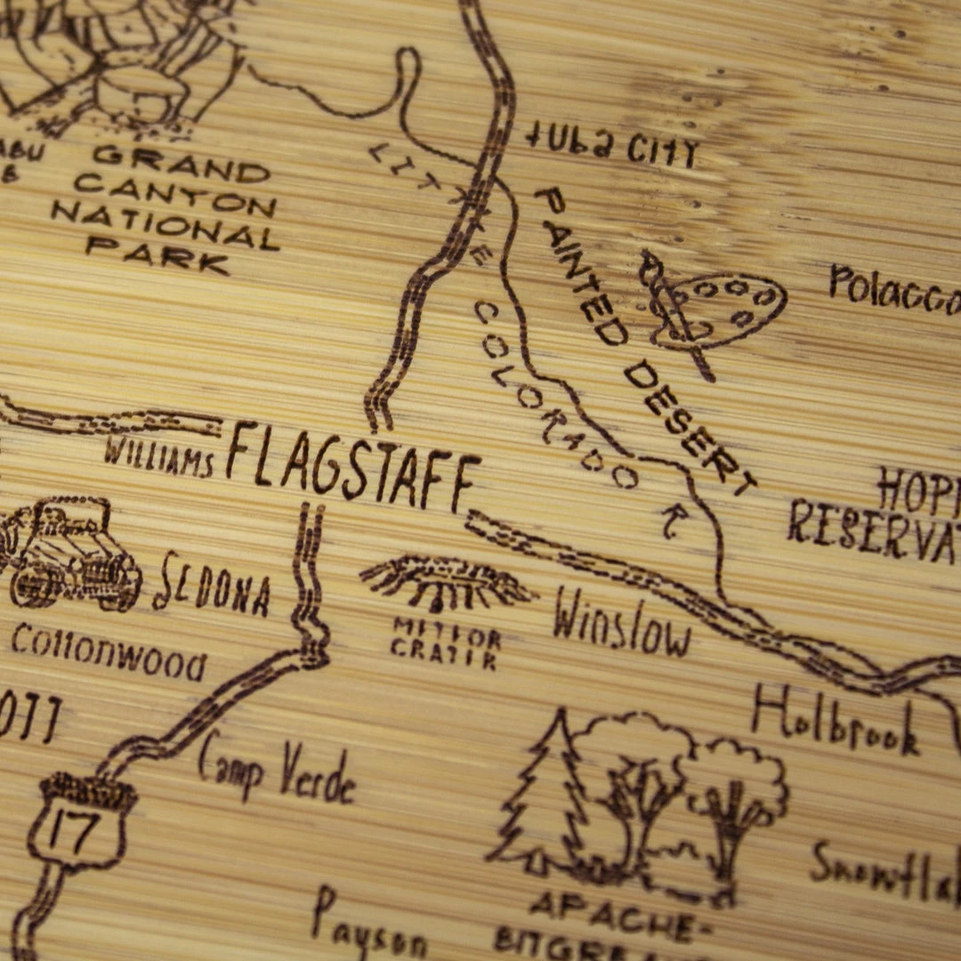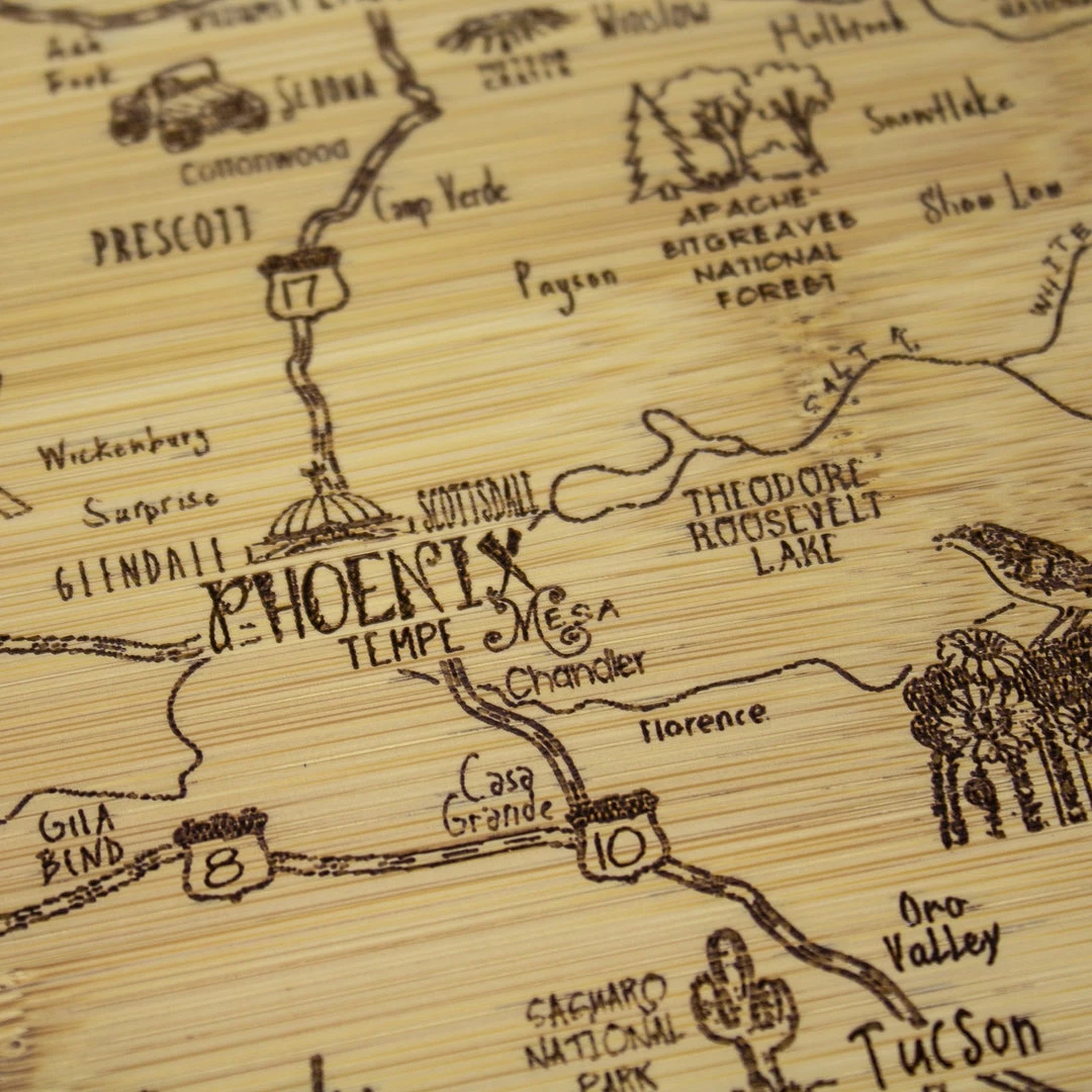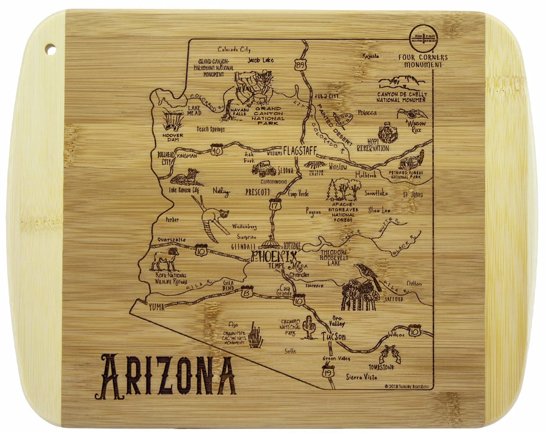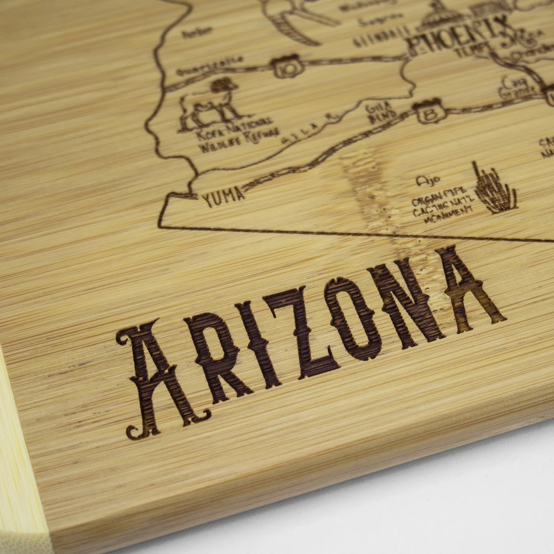 Savor a slice of The Grand Canyon State with the Totally Bamboo A Slice of Life Arizona Bamboo Serving and Cutting Board! This eye-catching serving board is a wonderful way to celebrate the state of Arizona. It’s a perfect choice to serve a selection of delicious cheeses, crackers and finger foods with friends and family. One side of the board features laser-etched artwork of the outline of the state and fun call outs of the top cities, sights and attractions. From Phoenix to Tucson, Flagstaff to Tombstone, The Grand Canyon to Saguaro National Park and everywhere in between, this board features everything that makes Arizona great. When not being used for serving, the board can be flipped over to provide an ideal large cutting board surface. The board is constructed of organically-grown Moso bamboo, which is gentler on knives than plastic and easier to care for than hardwood. The two-tone design clearly highlights the natural beauty of bamboo. The board measures 11″ x 8-3/4″ x 1/2″. Whether as a gift for the Arizonan in your life (or for yourself), this Slice of Life board is sure to be a hit!
