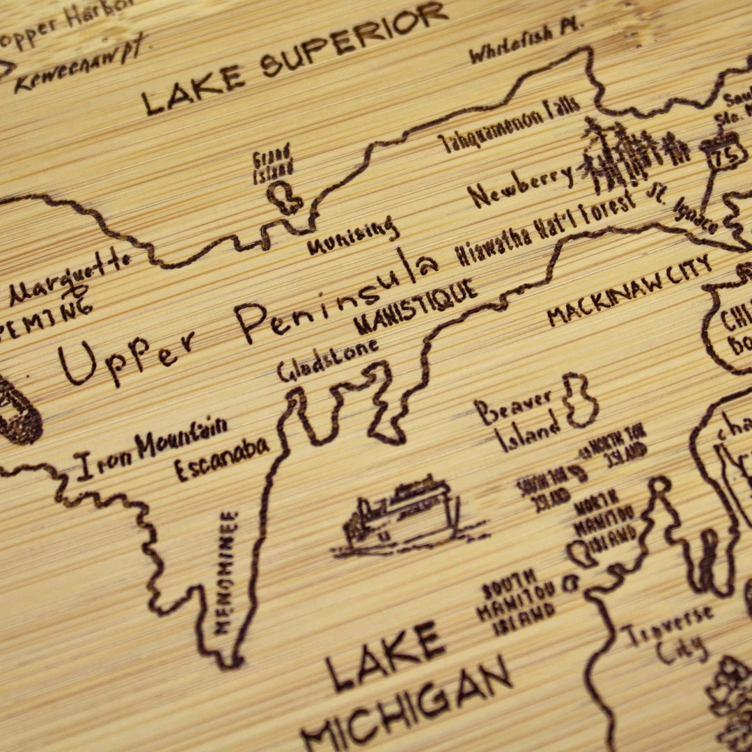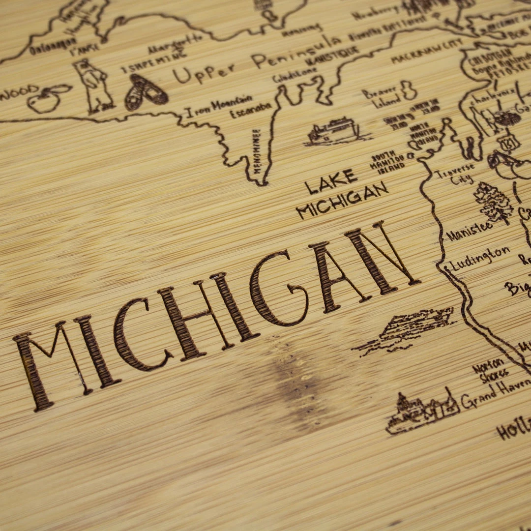 Savor a slice of The Great Lakes State with the Totally Bamboo A Slice of Life Michigan Bamboo Serving and Cutting Board! This eye-catching serving board is a wonderful way to celebrate the state of Michigan. It’s a perfect choice to serve a selection of delicious cheeses, crackers and finger foods with friends and family. One side of the board features laser-etched artwork of the outline of the state and fun call outs of the top cities, sights and attractions. From Ann Arbor to Cheboygan, Detroit to Cadillac, Kalamazoo to Lansing and everywhere in between, this board features everything that makes Michigan great. When not being used for serving, the board can be flipped over to provide an ideal large cutting board surface. The board is constructed of organically-grown Moso bamboo, which is gentler on knives than plastic and easier to care for than hardwood. The two-tone design clearly highlights the natural beauty of bamboo. The board measures 11″ x 8-3/4″ x 1/2″. Whether as a gift for the Michigander in your life (or for yourself), this Slice of Life board is sure to be a hit!