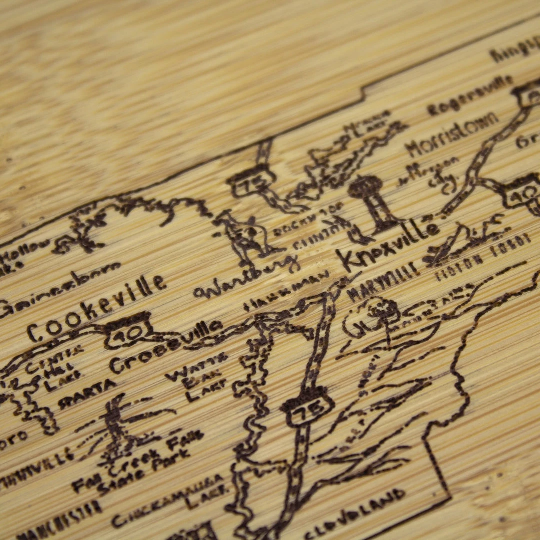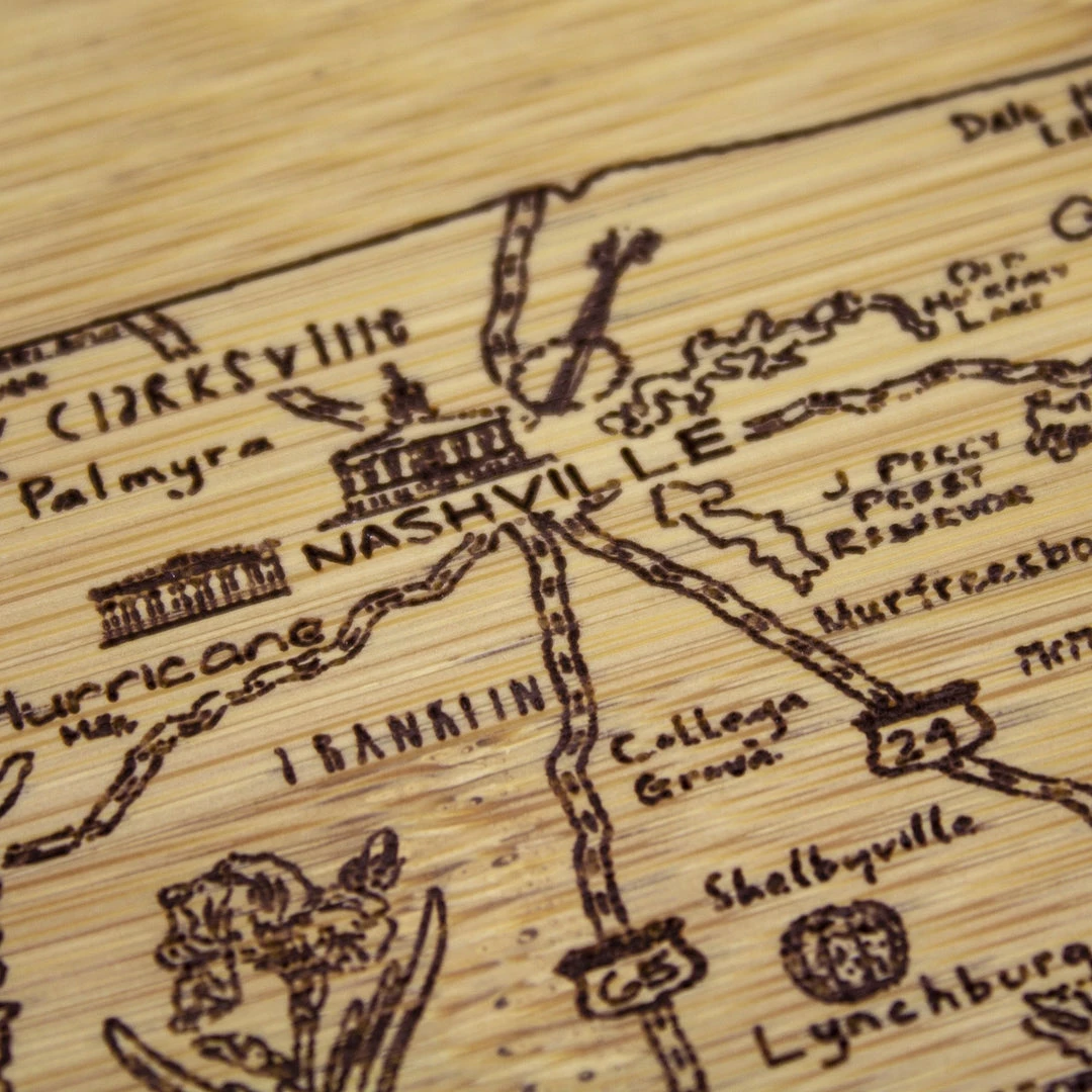 Savor a slice of The Volunteer State with the Totally Bamboo A Slice of Life Tennessee Bamboo Serving and Cutting Board! This eye-catching serving board is a wonderful way to celebrate the state of Tennessee. It’s a perfect choice to serve a selection of delicious cheeses, crackers and finger foods with friends and family. One side of the board features laser-etched artwork of the outline of the state and fun call outs of the top cities, sights and attractions. From Memphis to Bristol, Nashville to Chattanooga, the Mississippi to the Great Smoky Mountains and everywhere in between, this board features everything that makes Tennessee great. When not being used for serving, the board can be flipped over to provide an ideal large cutting board surface. The board is constructed of organically-grown Moso bamboo, which is gentler on knives than plastic and easier to care for than hardwood. The two-tone design clearly highlights the natural beauty of bamboo. The board measures 11″ x 8-3/4″ x 1/2″. Whether as a gift for the Tennessean in your life (or for yourself), this Slice of Life board is sure to be a hit!