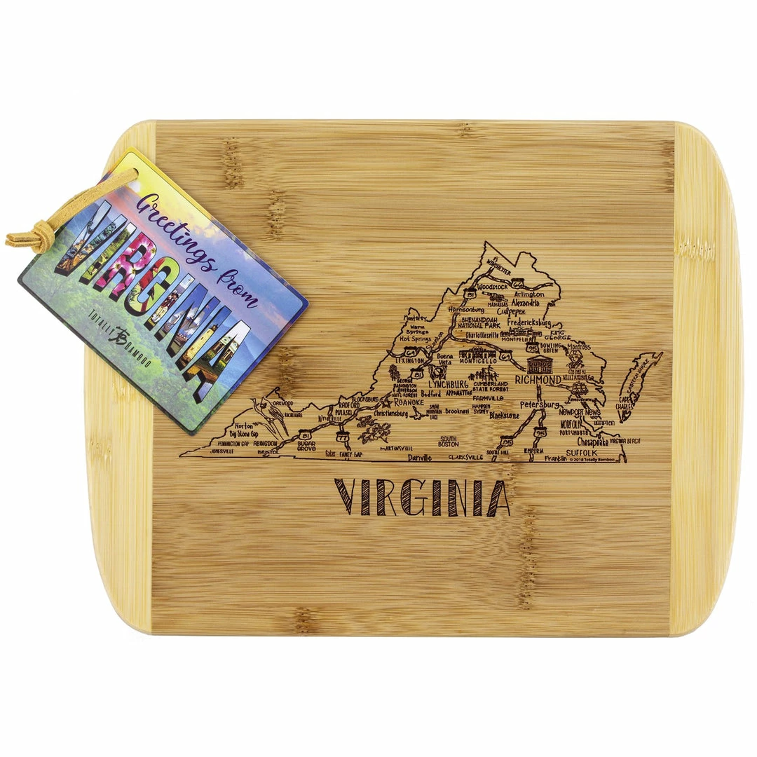 Savor a slice of The Old Dominion with the Totally Bamboo A Slice of Life Virginia Bamboo Serving and Cutting Board! This eye-catching serving board is a wonderful way to celebrate the state of Virginia. It’s a perfect choice to serve a selection of delicious cheeses, crackers and finger foods with friends and family. One side of the board features laser-etched artwork of the outline of the state and fun call outs of the top cities, sights and attractions. From Virginia Beach to Alexandria, Roanoke to Fredericksburg, Monticello to Jamestown and everywhere in between, this board features everything that makes Virginia great. When not being used for serving, the board can be flipped over to provide an ideal large cutting board surface. The board is constructed of organically-grown Moso bamboo, which is gentler on knives than plastic and easier to care for than hardwood. The two-tone design clearly highlights the natural beauty of bamboo. The board measures 11″ x 8-3/4″ x 1/2″. Whether as a gift for the Virginian in your life (or for yourself), this Slice of Life board is sure to be a hit!