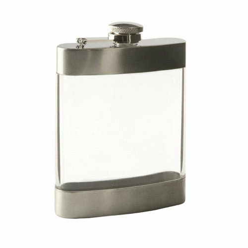 This tell it all flask is made from clear acrylic and stainless steel. The True Fabrications Clear Flask holds 6 oz. Twist and lift lid.